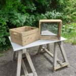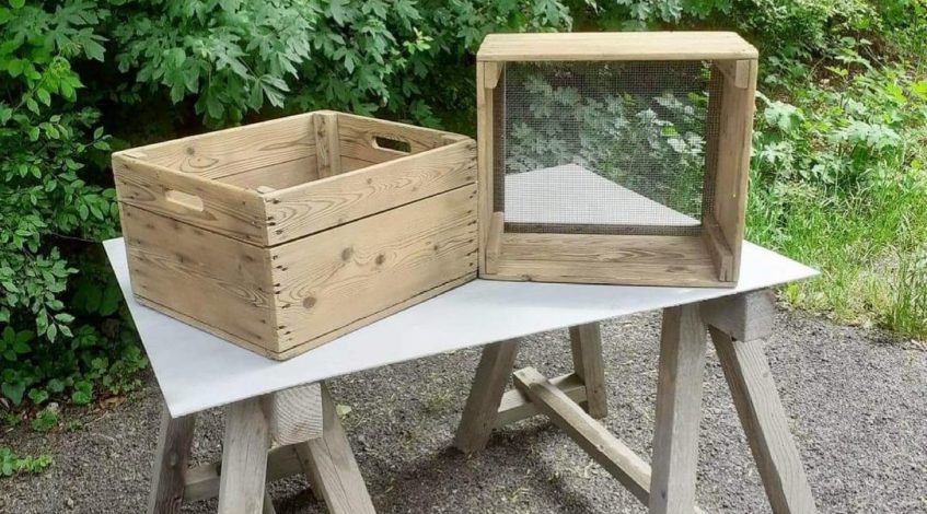 Deux caisses vintage dont l’une est grillagée avant et après un traitement d’aérogommage